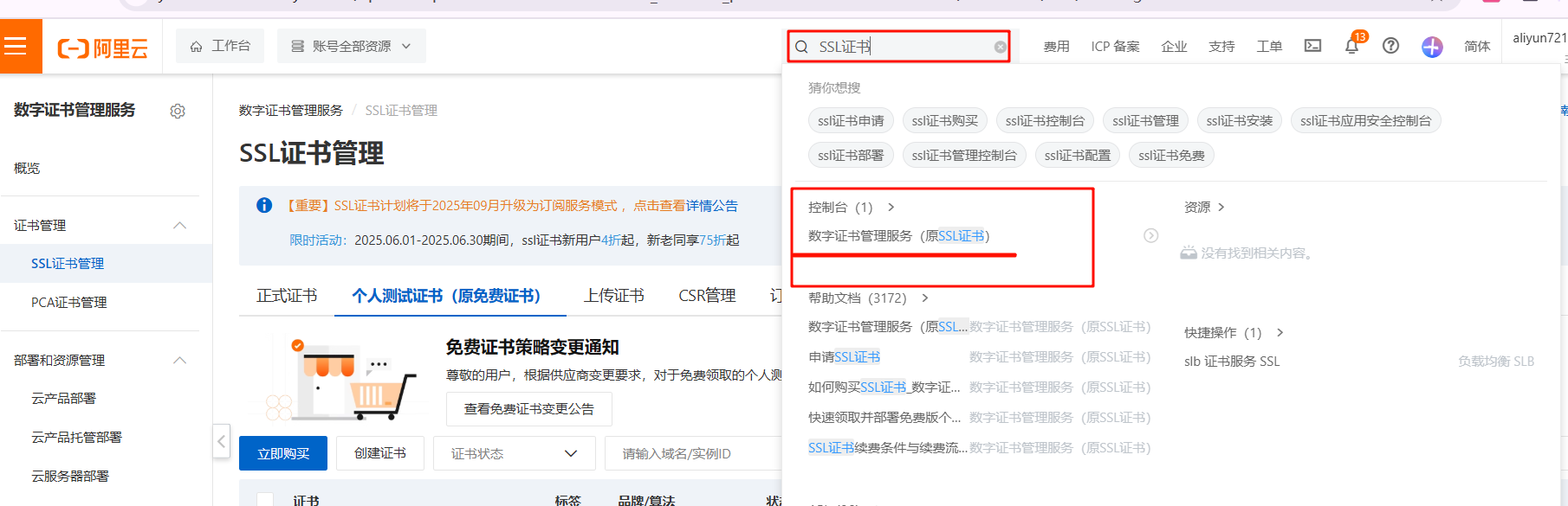 1.登陆阿里云,然后搜索SSL证书,点击控制台里边那个 数字证书管理服务