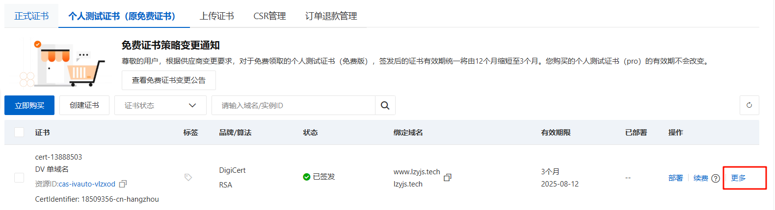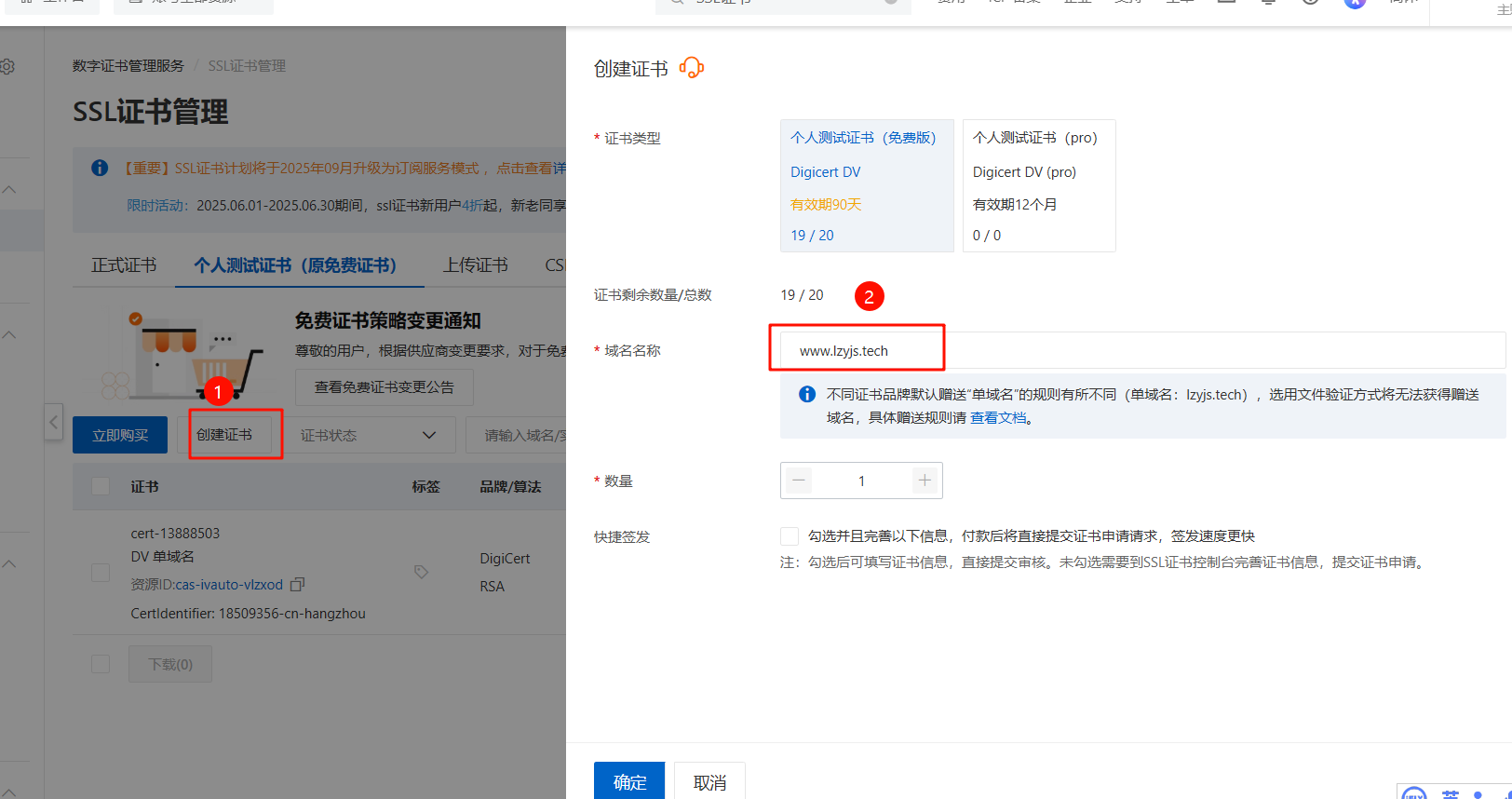 SSL证书可以通过 自签的形式 也可以从厂商中获取。本次我采用的是从阿里云获取免费的个人测试证书,一个账号可以获取20个SSL证书。这个测试证书的有效期为3个月如果证书过期可以重新获取,并重新部署到Nginx上。